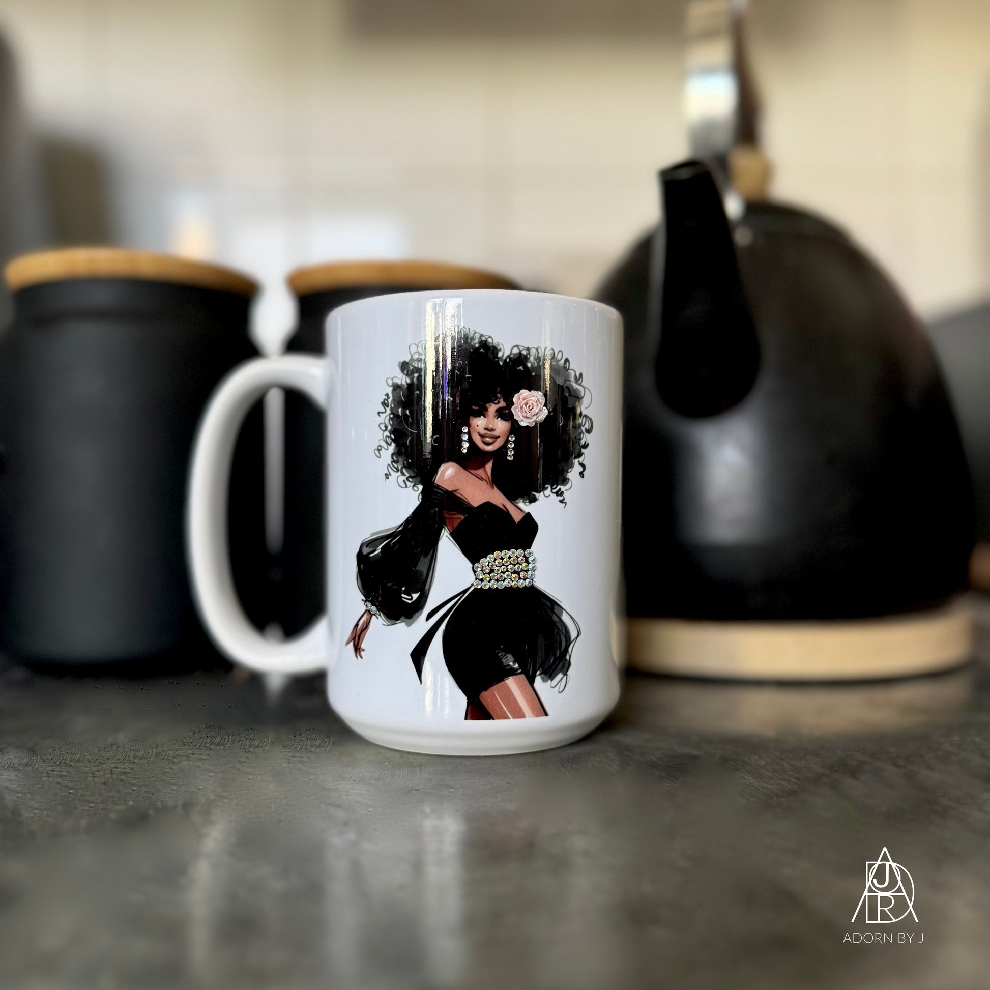 *All mugs are handmade, so no two will be exactly alike. The placement of rhinestones will be different, and the colour or style of flowers and accessories (if included) may also differ from mug to mug.