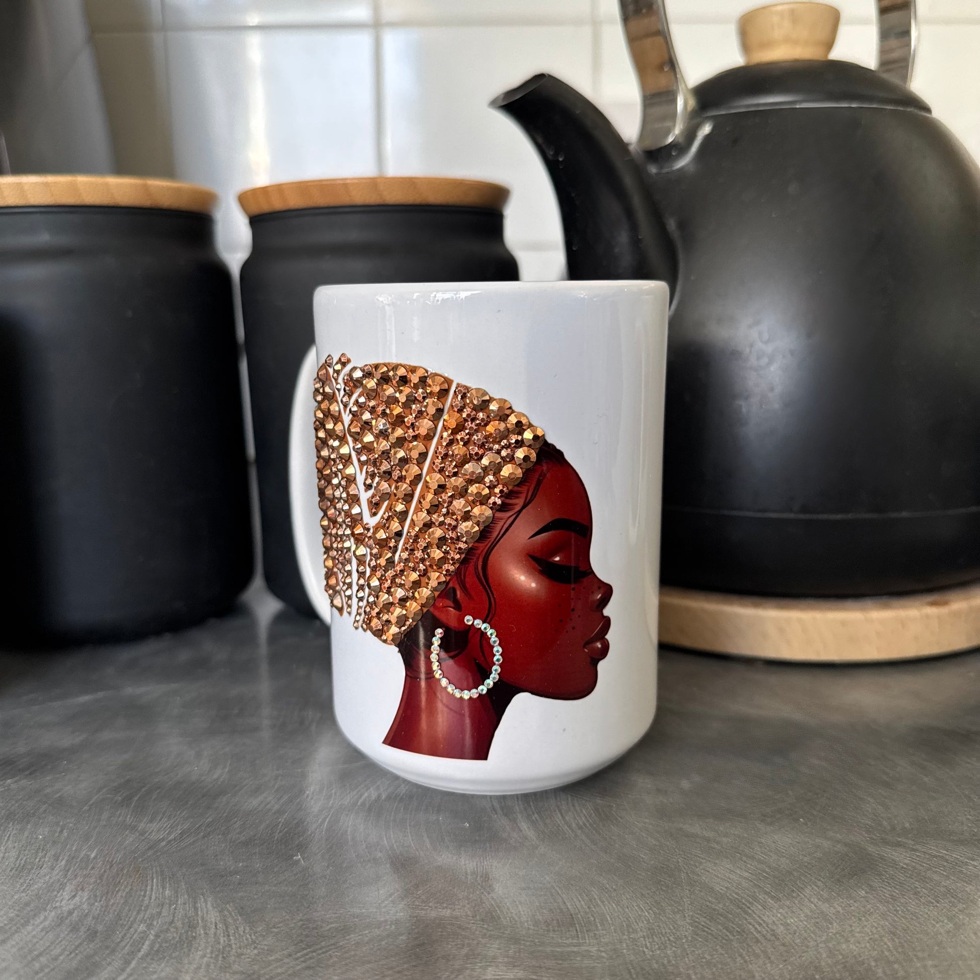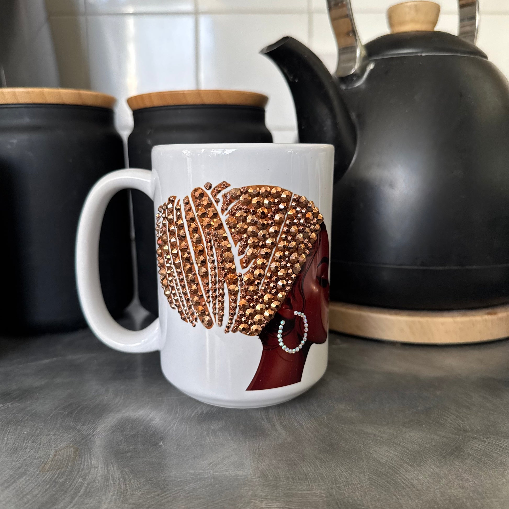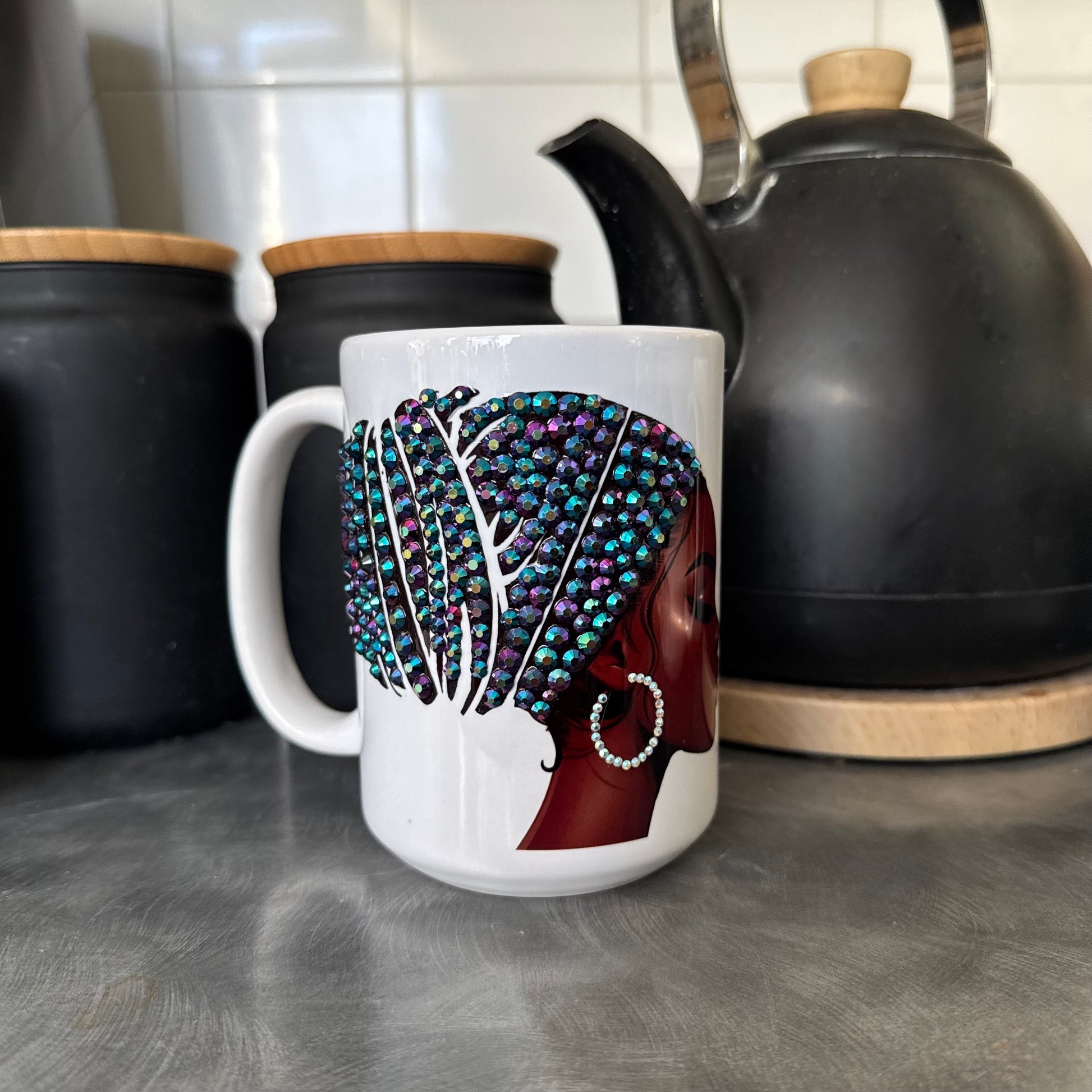 *All mugs are handmade, so no two will be exactly alike. The placement of rhinestones will be different, and the colour or style of flowers and accessories (if included) may also differ from mug to mug.