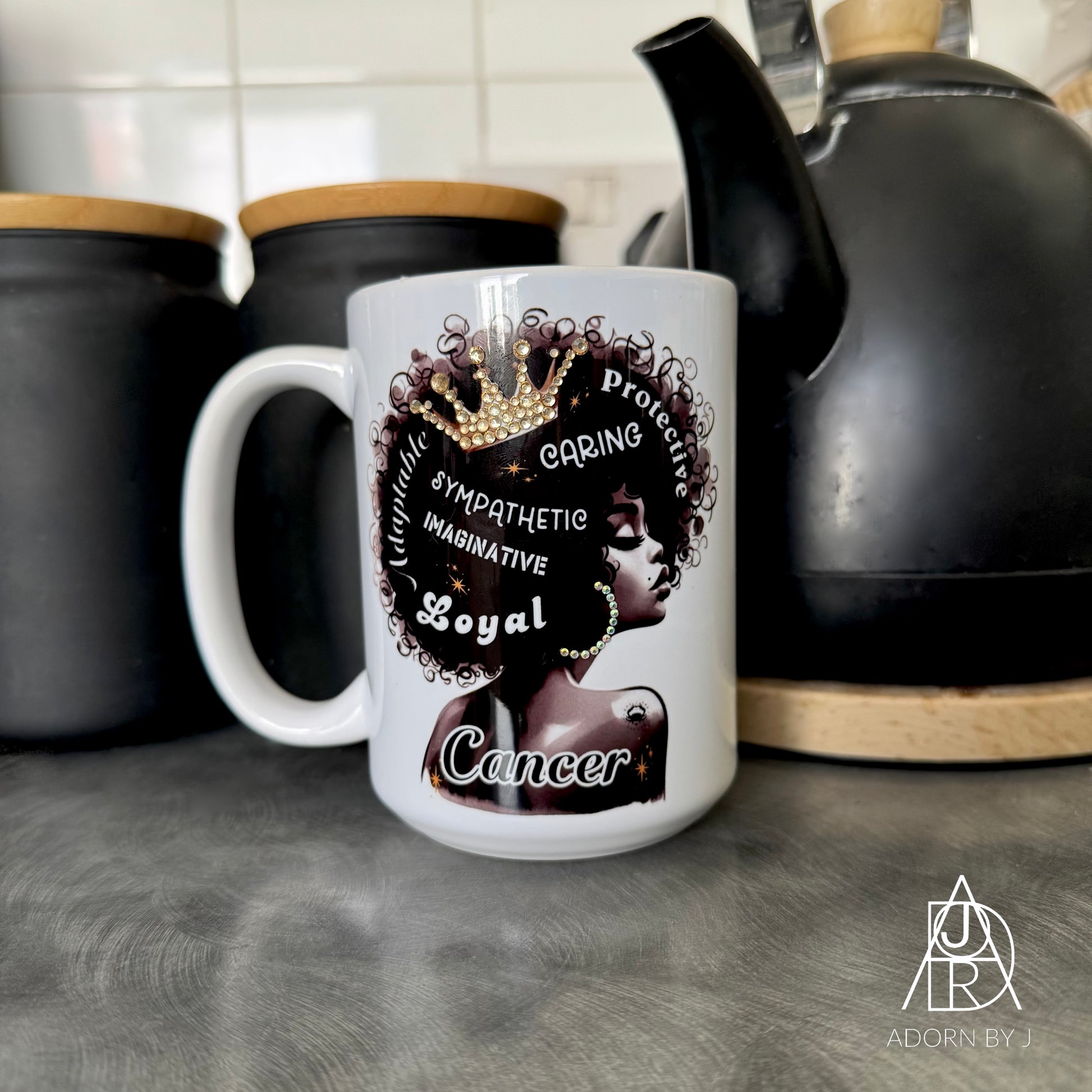 *All mugs are handmade, so no two will be exactly alike. The placement of rhinestones will be different, and the colour or style of flowers and accessories (if included) may also differ from mug to mug.