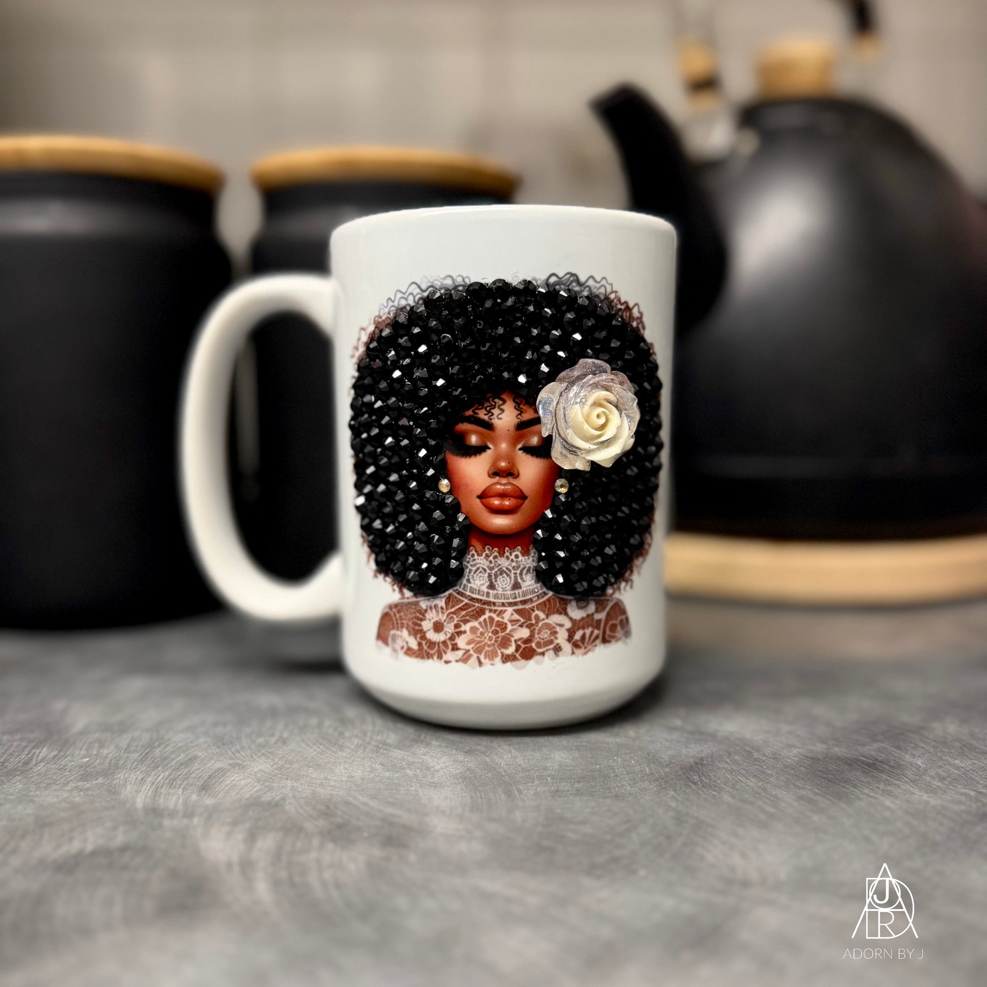 *All mugs are handmade, so no two will be exactly alike. The placement of rhinestones will be different, and the colour or style of flowers and accessories (if included) may also differ from mug to mug.