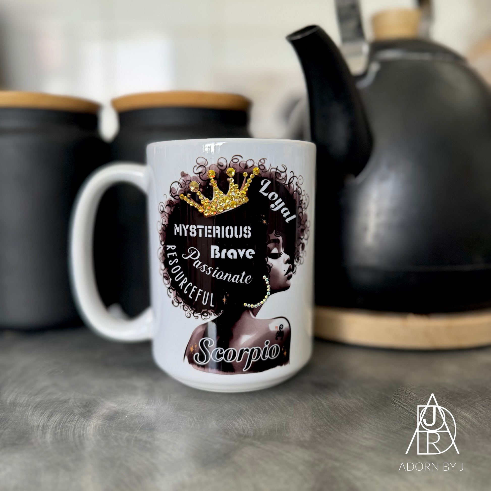 *All mugs are handmade, so no two will be exactly alike. The placement of rhinestones will be different, and the colour or style of flowers and accessories (if included) may also differ from mug to mug.