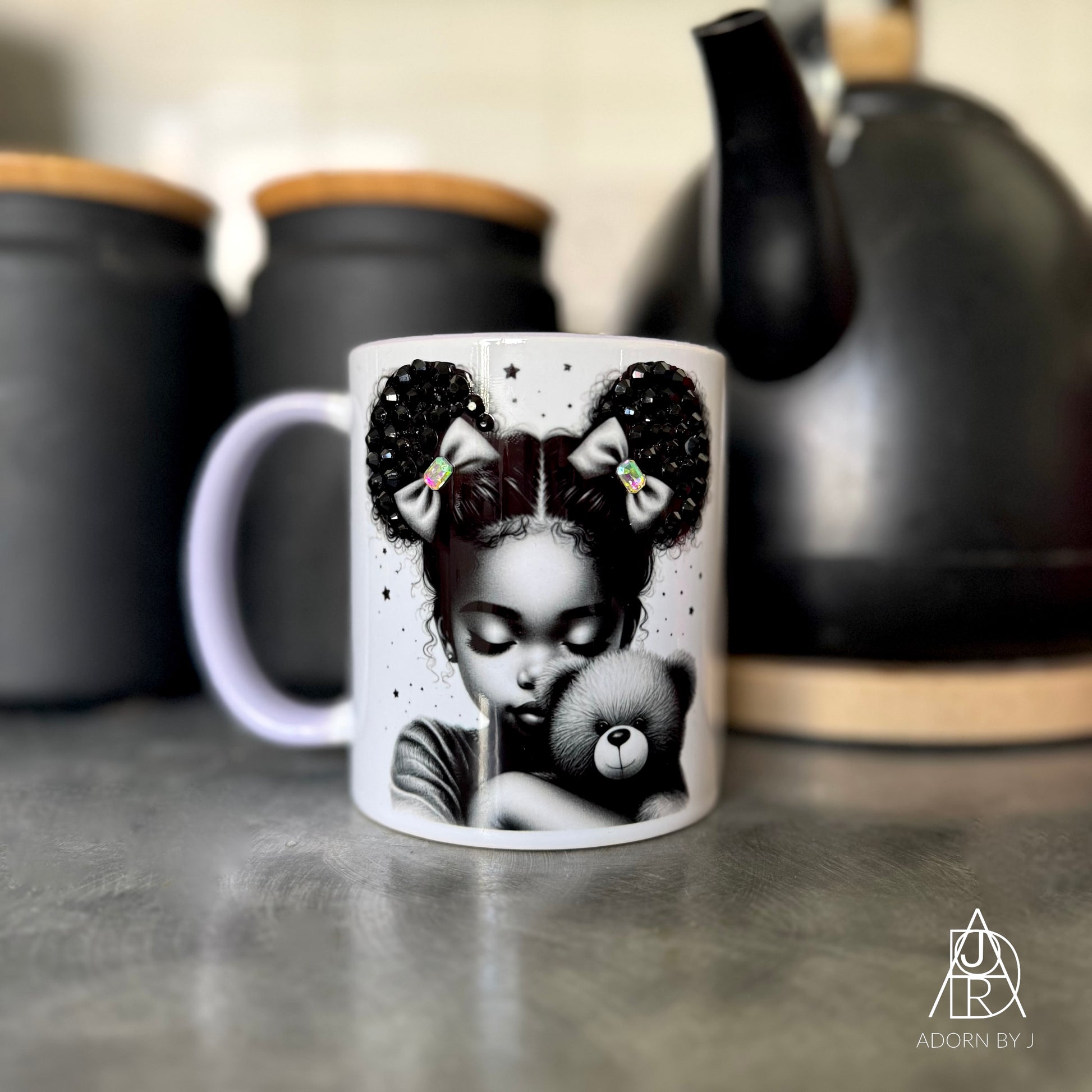 All mugs are handmade, so no two will be exactly alike. The placement of rhinestones will be different, and the colour or style of flowers and accessories (if included) may also differ.