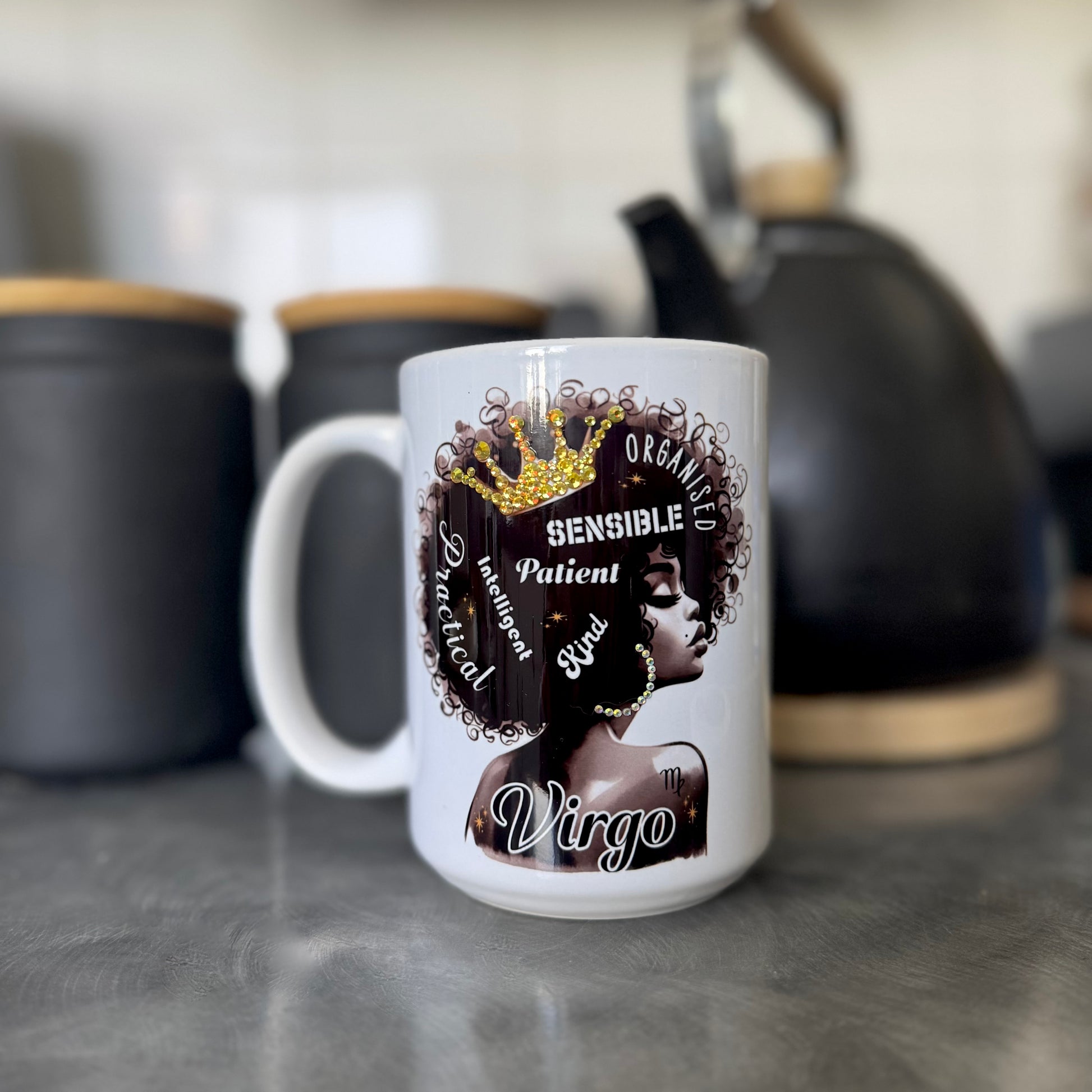 *All mugs are handmade, so no two will be exactly alike. The placement of rhinestones will be different, and the colour or style of flowers and accessories (if included) may also differ from mug to mug.